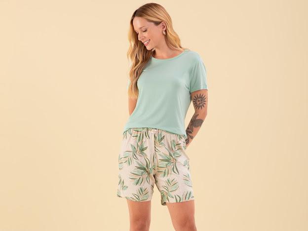 Confeccionado em viscolycra macia e fresca, ele envolve o corpo com suavidade, garantindo liberdade de movimento e um toque delicioso na pele. A blusa verde suave transmite calma e frescor, enquanto o bermudol com estampa de folhagens traz uma estética natural, moderna e extremamente charmosa.