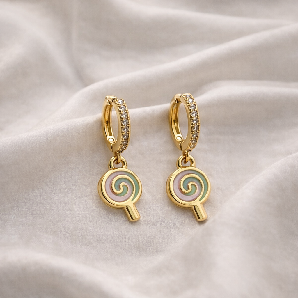 Confeccionado em semijoia banhada a Ouro 18K, possui argolinha delicadamente cravejada em zircônias e um charmoso pingente de pirulito esmaltado em tons de rosa e azul, trazendo um toque lúdico, moderno e encantador.