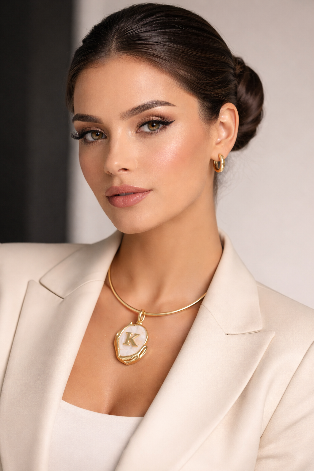 O aro estruturado valoriza o colo com imponência e delicadeza ao mesmo tempo.