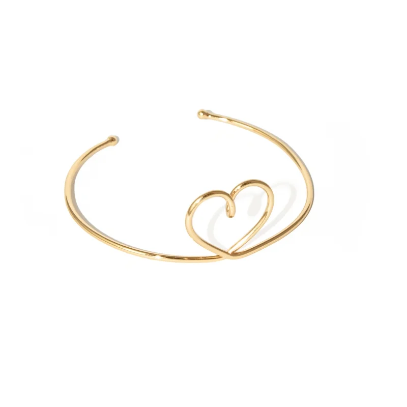 Seu fio dourado fino, com um coração vazado central, representa amor, afeto e conexão — um símbolo eterno traduzido em elegância discreta. A estrutura aberta e ajustável proporciona conforto absoluto, adaptando-se perfeitamente ao pulso com leveza e segurança.